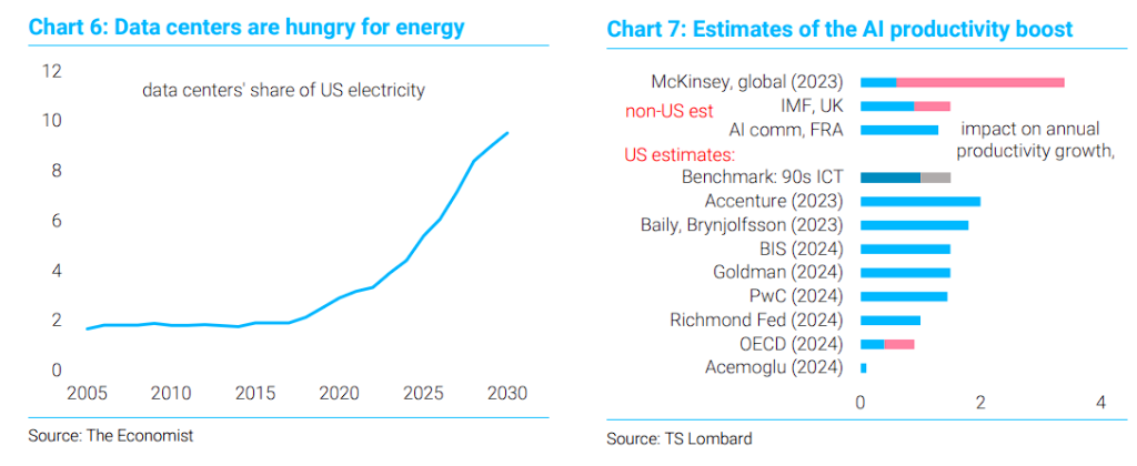 关键问题是:只有小部分就业基于认知或知识密集型活动(建筑、制造和专业服务仍有很强物理成分)。各方对AI年度生产率贡献的估计差异巨大:麦肯锡预测达4%,而麻省理工学者阿西莫格鲁仅预测0.5%。重现1990年代生产率增幅(年均增加1.5个百分点)的难度很大。